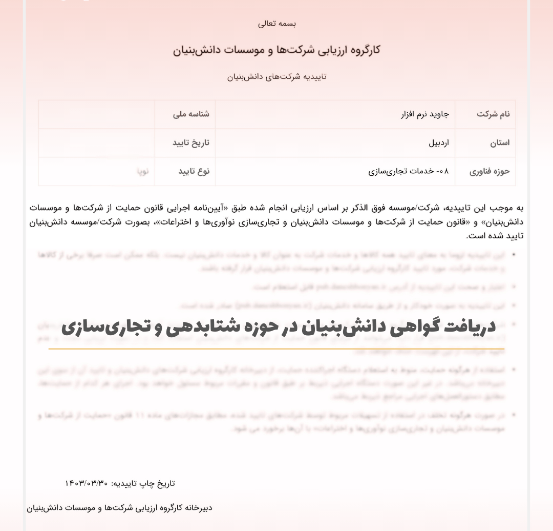 دریافت صلاحیت سطح یک شتابدهی نوآوری و گواهی دانشبنیانی توسط شتابدهنده جاویدان