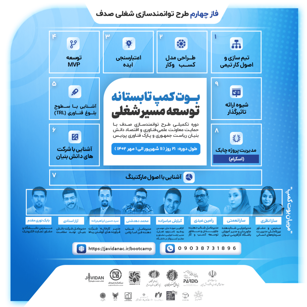دوره تکمیلی طرح توانمندسازی شغلی صدف از برنامههای فاز چهارم این طرح با حمایت معاونت علمی،فناوری و اقتصاد دانشبنیان ریاست جمهوری، پارک فناوری پردیس،پارک علموفناوری استان اردبیل و بنیاد نخبگان استان اردبیل با عنوان بوتکمپ تابستانه توسعه مسیر شغلی (جاویدان کمپ) از 11 شهریورماه الی 1 مهرماه 1402 توسط شتابدهنده جاویدان برگزار میشود.